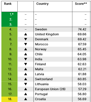 Hungary and Slovenia supersede Poland as the worst performing EU country in this year’s index, all of them ranked as very low performers. Seven EU countries (excluding the UK) and the EU as a whole rank under high performers this year.