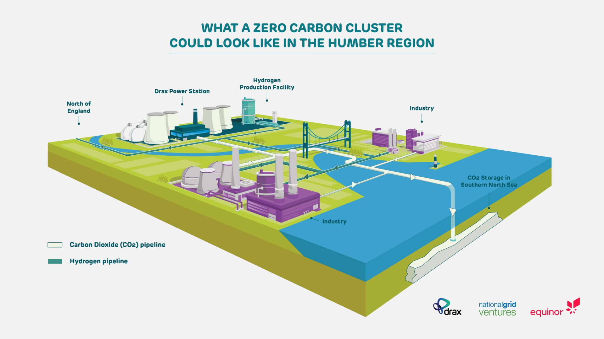 Energy companies Drax Group, Equinor and National Grid have joined to develop the UK’s “first zero carbon cluster” in line with the Committee on Climate Change’s Net Zero report, which emphasised the importance of carbon capture and hydrogen technology in the UK’s drive toward net zero emissions. The partnership is concerned with scale, claiming that large-scale projects like the planned zero carbon cluster are necessary to reach zero emission goals by 2050. The partnership plans to integrate Humber's existing industries into a cluster connected by carbon capture and storage technology and hydrogen production.